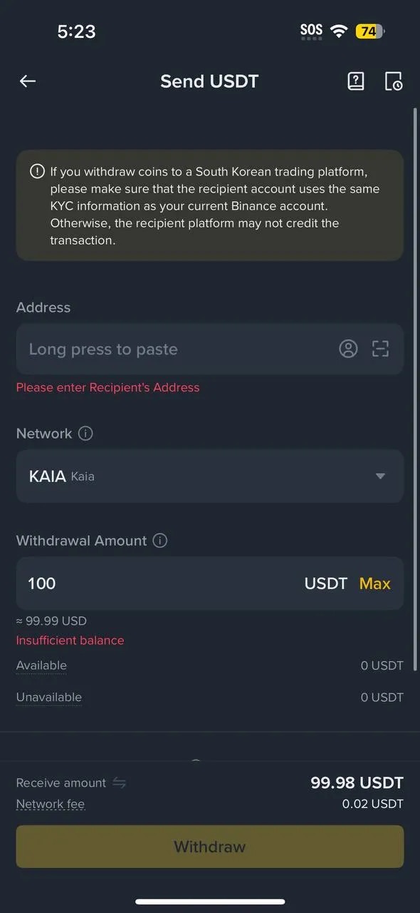 - Set the withdrawal network to Kaia
