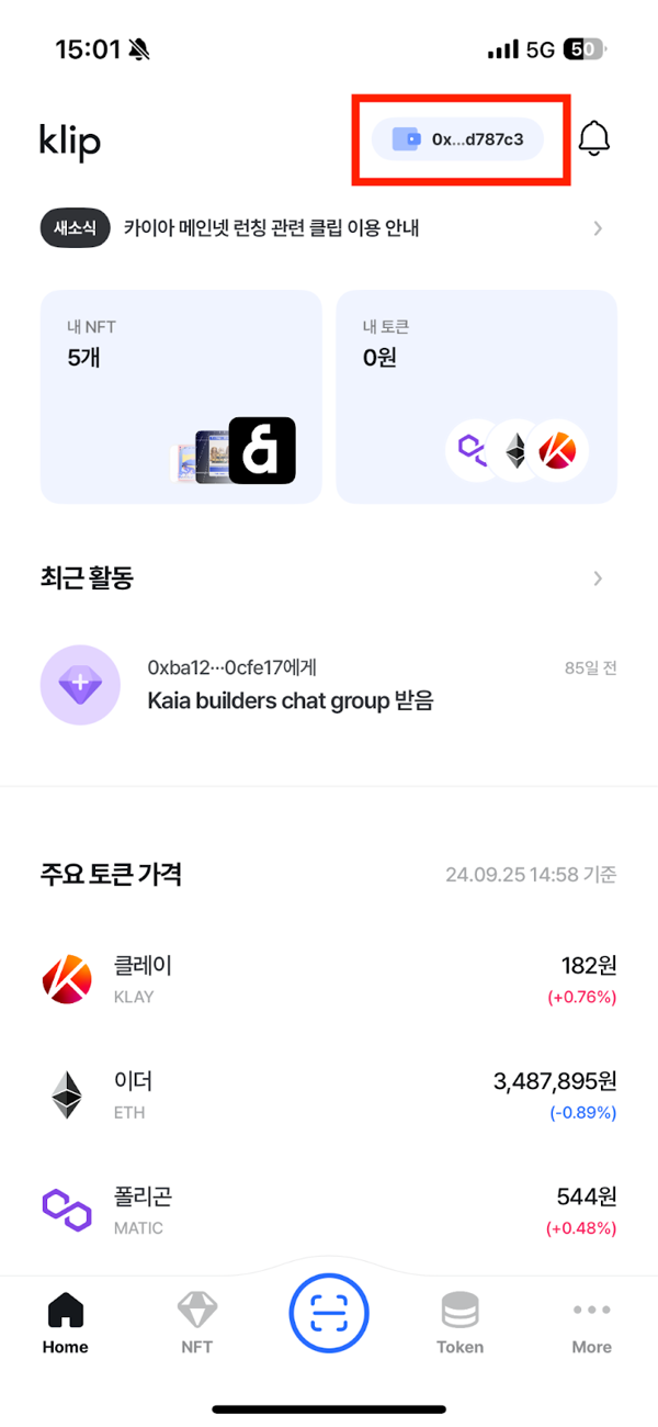 - Open the Klip app -> top-right wallet icon -> tap Copy under your personal wallet address