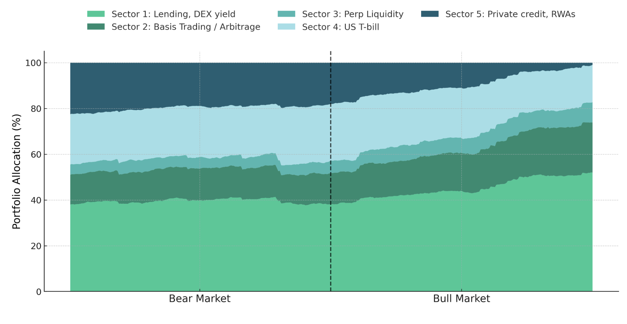 This low correlation enables counter-cyclical rebalancing: during bull markets, DeFi exposure can be increased to capture higher risk-adjusted returns, while in bear markets, RWA allocation is expanded to preserve stability and sustain baseline yield. Such diversification smooths portfolio volatility, enhances the liquidity-adjusted Sharpe ratio, and keeps performance more consistent across market regimes.